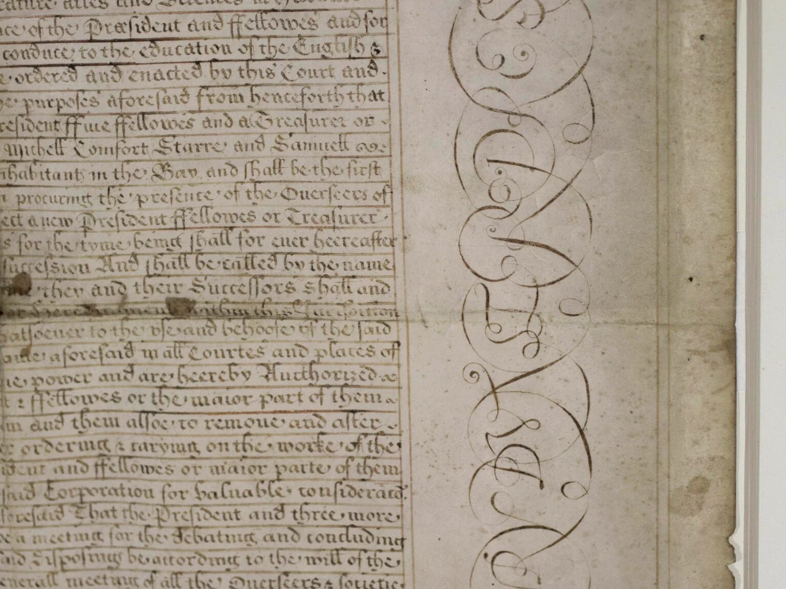 Drafted by Henry Dunster, the Charter of 1650 called for the Harvard Corporation to consist of seven individuals: the President, five Fellows, and a Treasurer. The Charter named the Corporation as the “President and Fellowes of Harvard College” and transferred to them, in “perpetual succession,” the duties of managing the College.