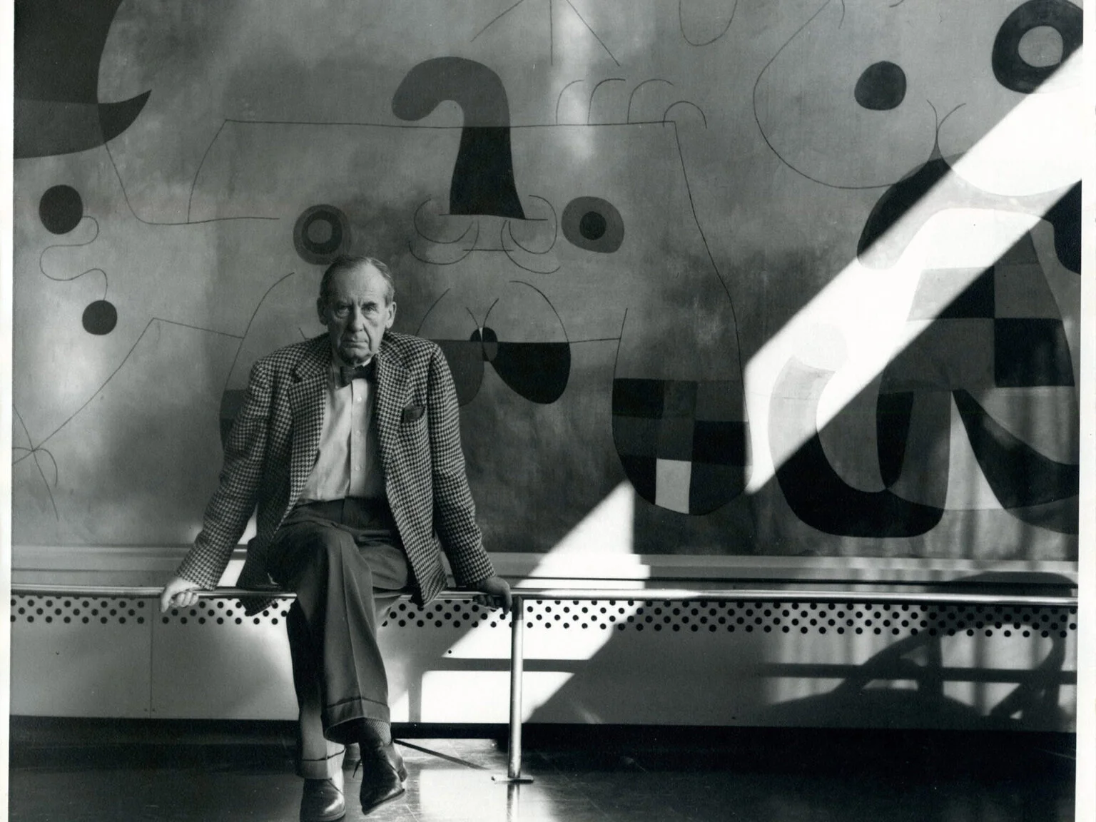 Pictured: Portrait of Bauhaus founder Walter Gropius with Joan Miro mural at Harvard’s Graduate Center.