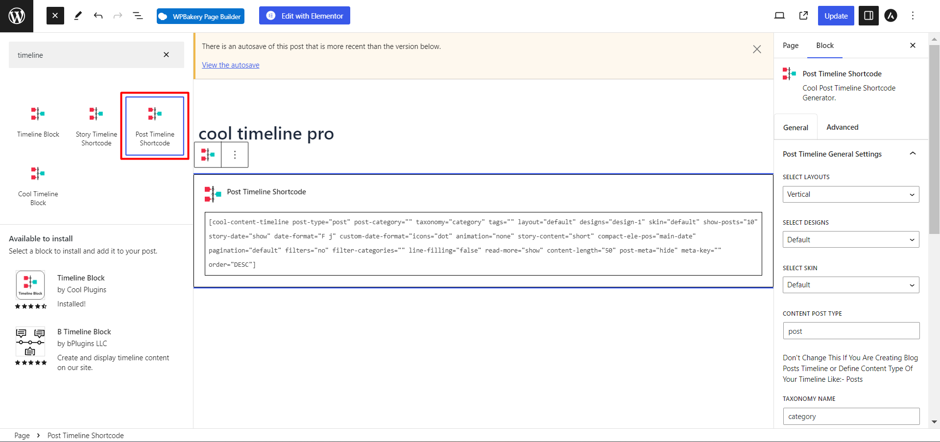- To create a vertical time line Goto Pages/Post >> Add new page/Post >> Choose Post Timeline shortcode.
