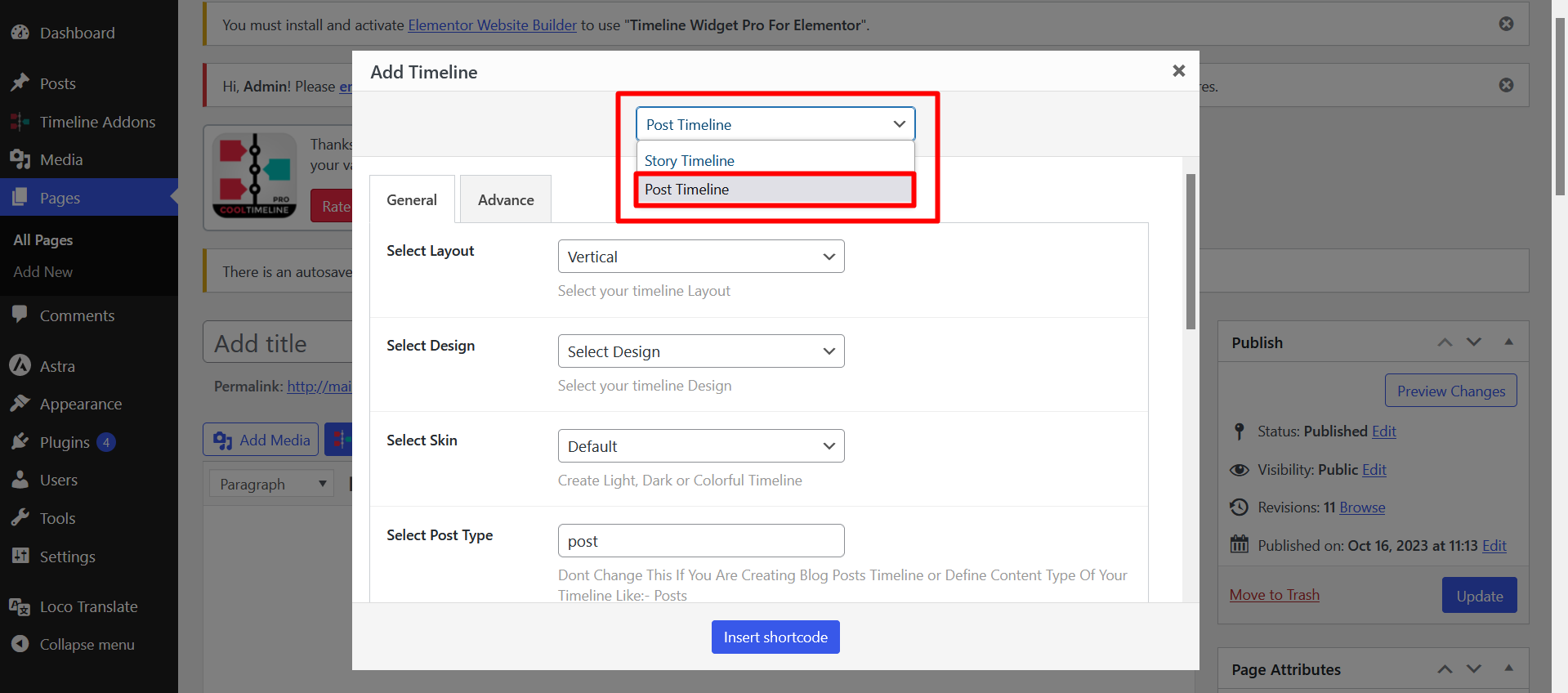 To display existing posts to a particular page Go to Pages >> Add new >> Add Timeline Shortcode >> Post Timeline .