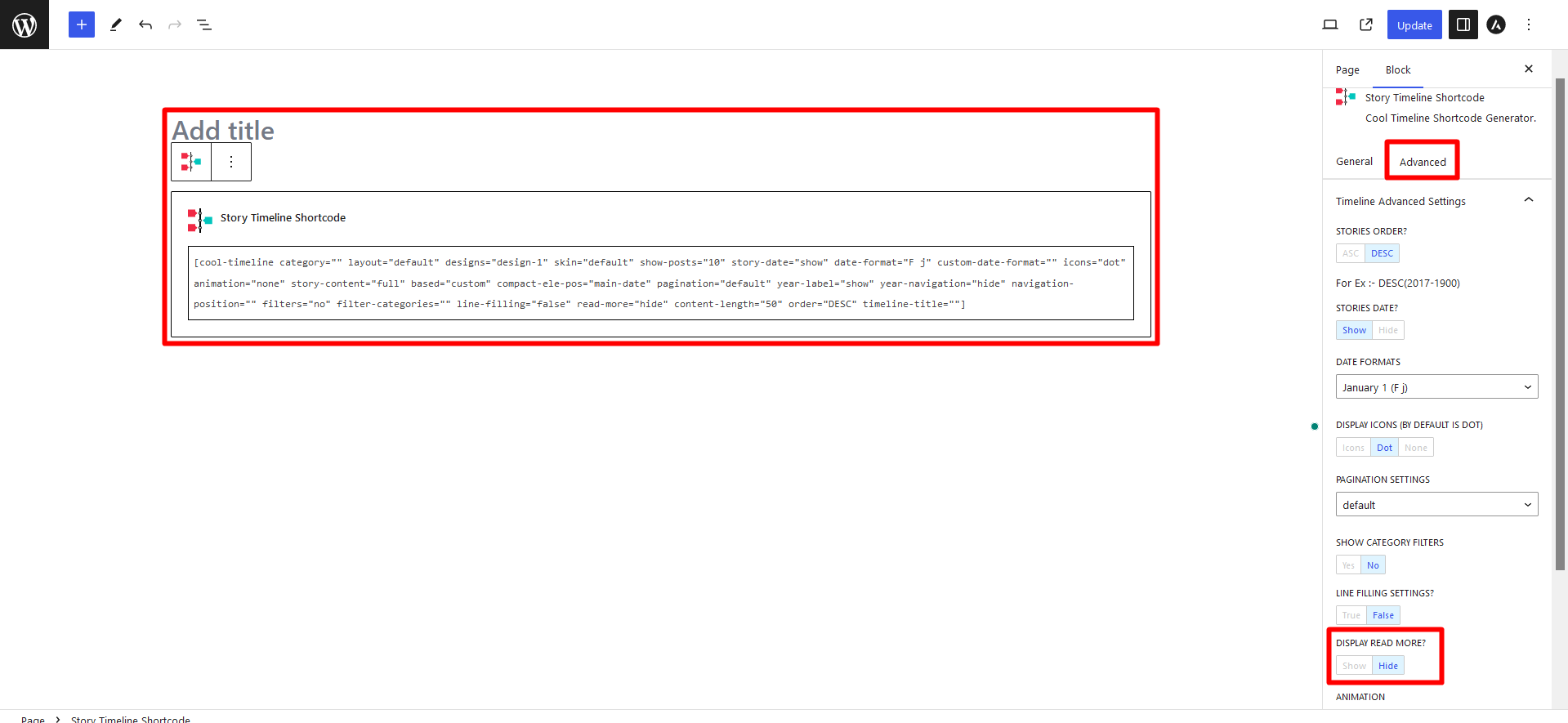 Go to Story Timeline Shortcode >> Advanced>> Display read more: Hide.