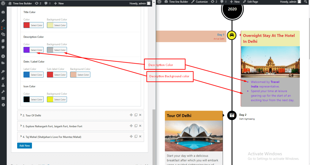This section is dedicated to custom colour options for specific timeline item/story. These options can be used to make the timeline story to match the specific colour scheme. The setting’s field description and screenshot below will help you to understand the settings and their effects on front end where the timeline is displayed.